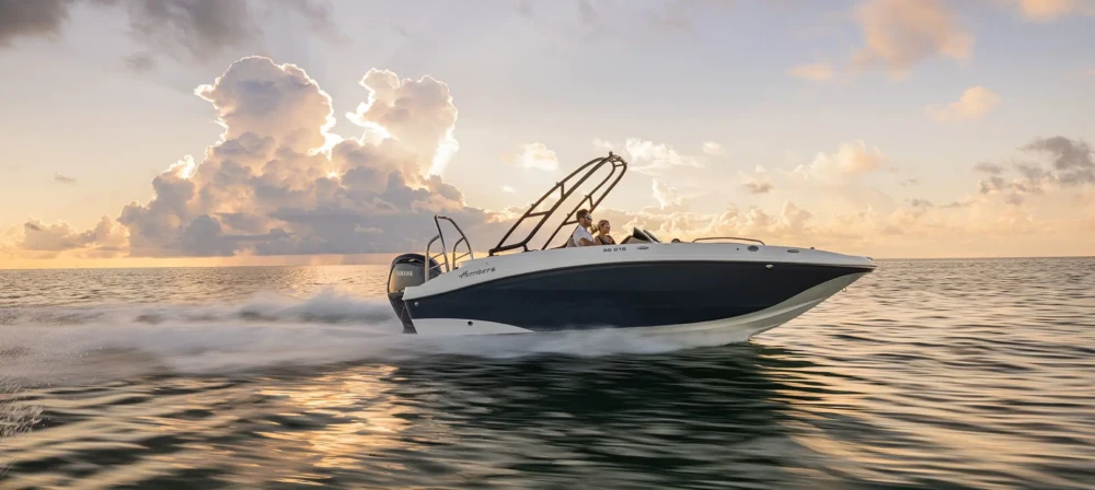 This model features an outboard engine, known for its easy maintenance, fuel efficiency, and quiet operation, making it a popular choice for all-around family fun.