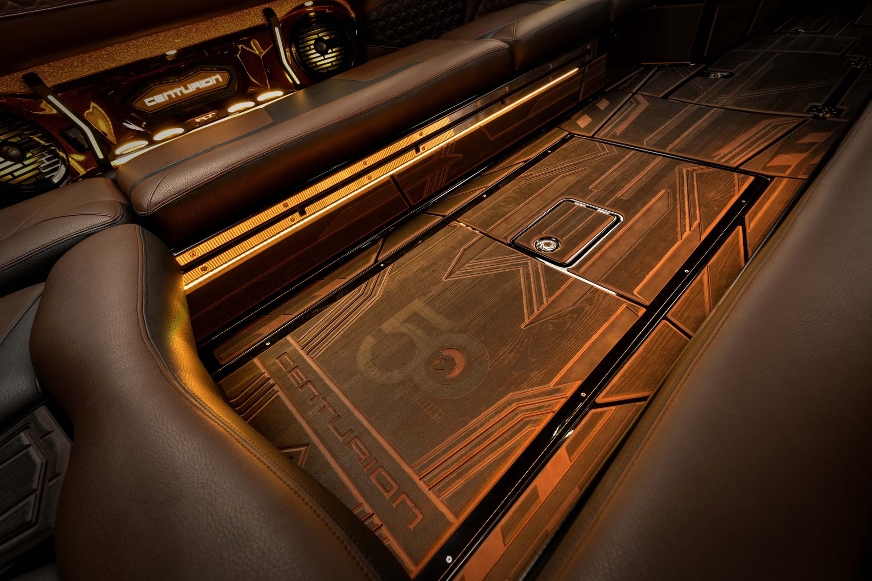 From their shimmering Root Beer and Gold Metal Flake accents to the retro-inspired lines, these models nod to Centurion’s earliest designs while pointing boldly toward the future. Inside, the warm Saddle Brown and Onyx Black interior, stitched with the Double Helix pattern, reflects the DNA that has carried Centurion from a small California shop to a global leader in wake sports. This limited edition is more than a celebration—it is a bridge. It honors the pioneers who imagined what didn’t exist, the riders who pushed the sport forward, and the families who made Centurion part of their lives. At the same time, it embodies the relentless drive to keep innovating, keep listening, and keep making life better on the water. Each one carries half a century of passion in its design and the promise of the next fifty years in its wake. To own one is to claim a unique piece of Centurion history.