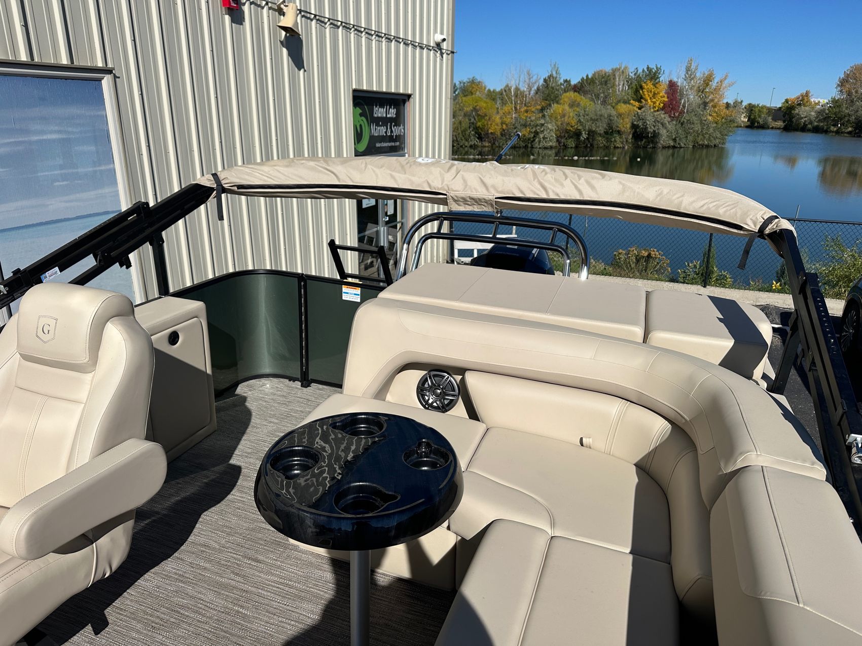 This pontoon boat promises superior comfort with its plush seating and modern amenities. The seats are elegantly upholstered, providing a comfortable area to relax and soak in the surroundings. It also includes a state-of-the-art audio system for entertainment, a table for alfresco dining, and a bimini top for shade on sunny days.