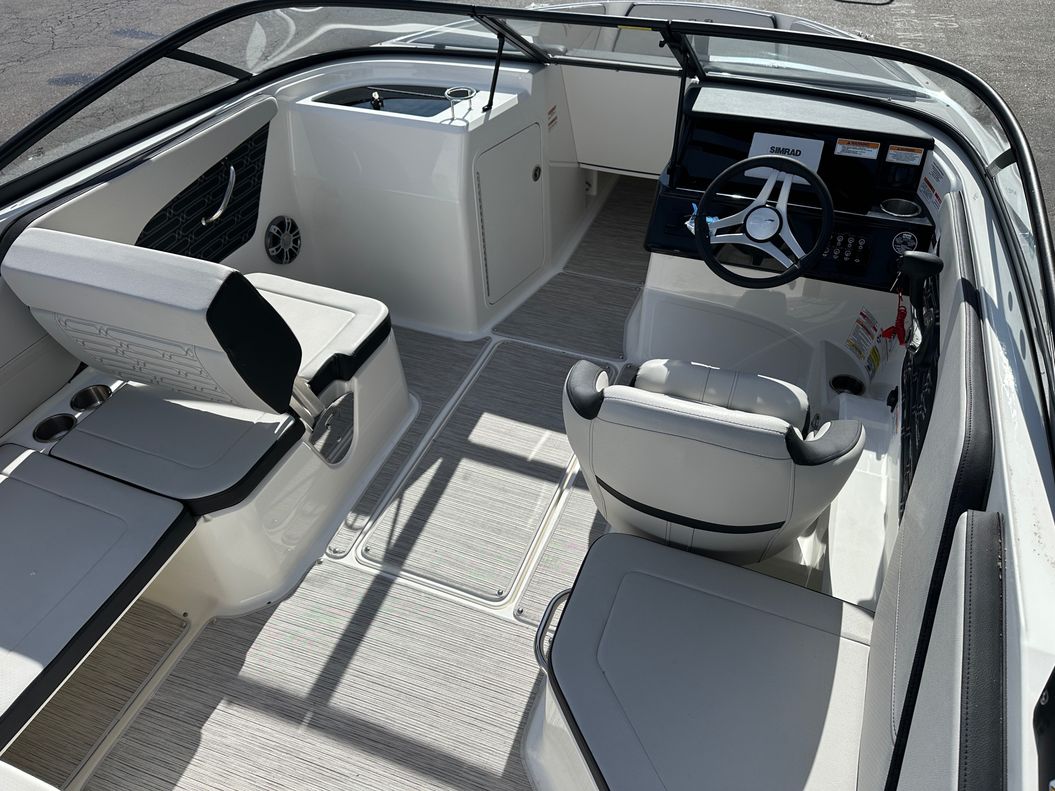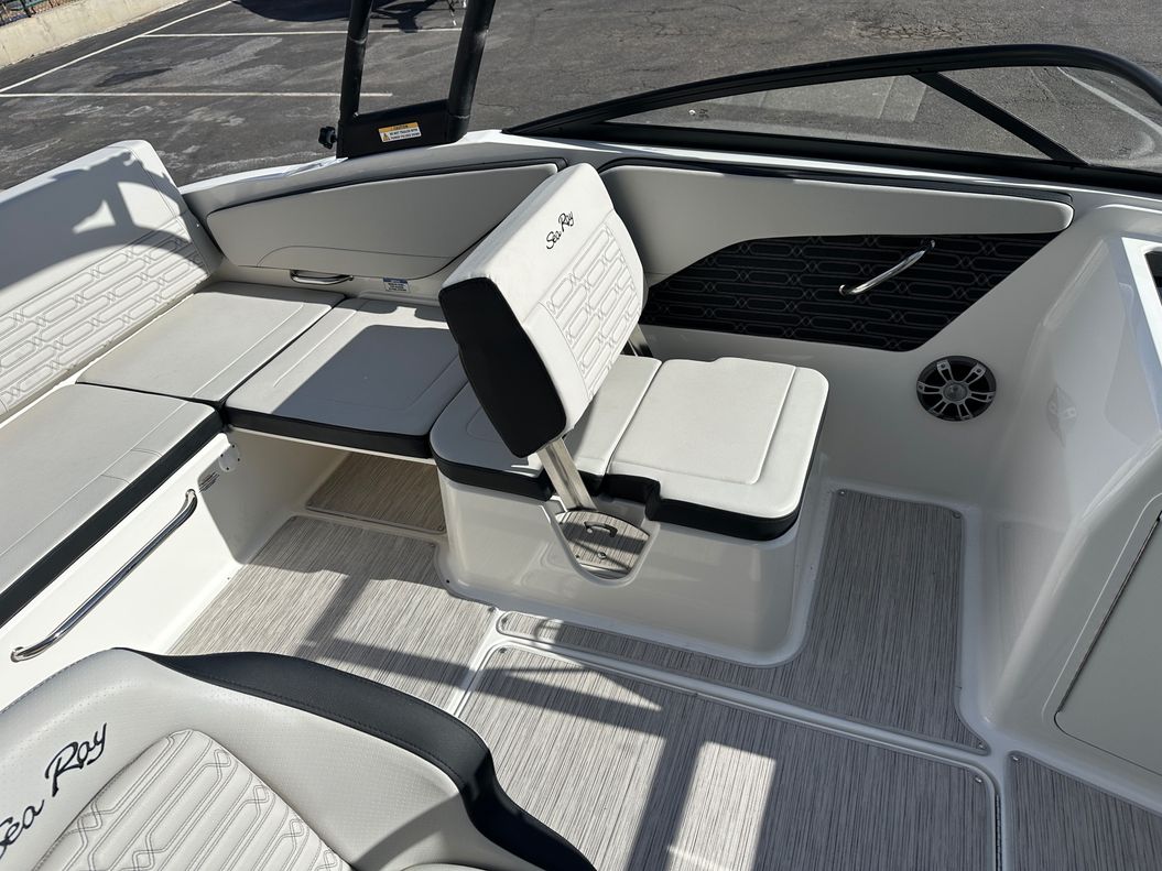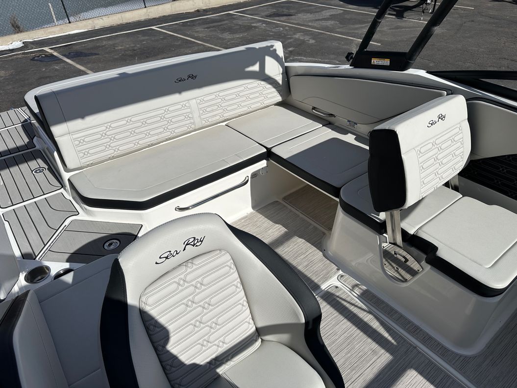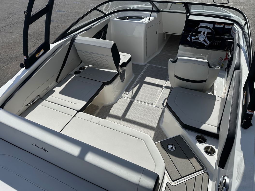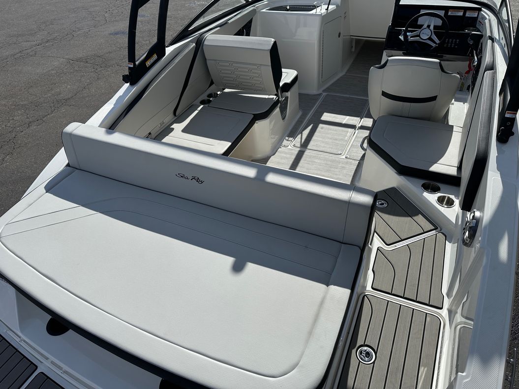 This model is packed with top of the range features like an optional water sports tower, immersive sound system, and advanced Simrad® GO5 touchscreen navigation system. Some other standard specifications include a power steering, stainless-steel handrails and cleats, a large swim platform, and custom Sea Ray instrumentation with a glass gauges.