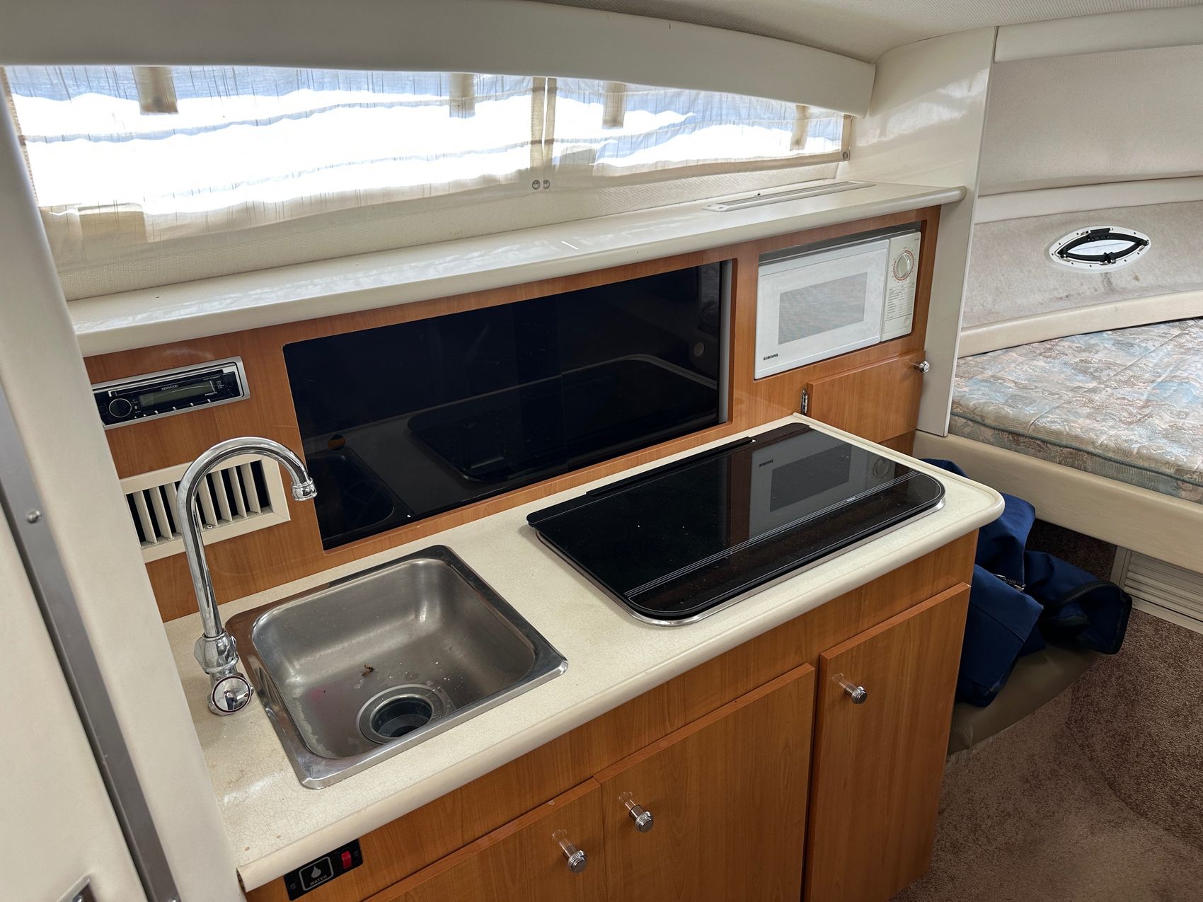 Onboard Amenities: Boasting an intuitively-designed helm with excellent visibility, the 2001 Bayliner 2855 Ciera offers plentiful seating arrangements, a cozy aft cabin, and a credible dinette. The galley is equipped with requisite appliances such as a microwave, refrigerator, and a two-burner stove.